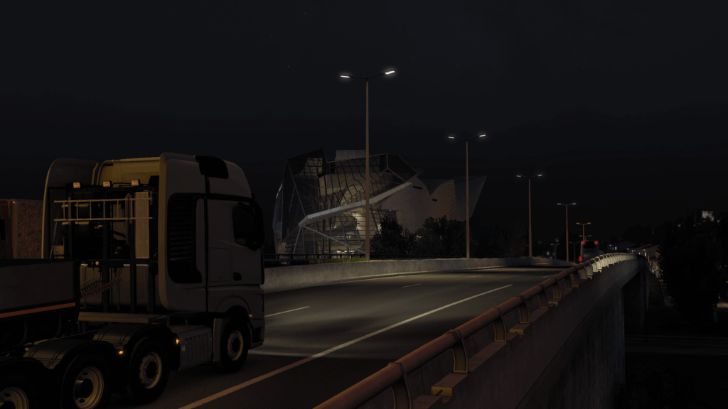 Nach Einbruch der Dunkelheit taucht das Musée des Confluences mit seiner beleuchteten Silhouette auf. Glasflächen, Kanten und Lichtkegel bilden eine futuristische Kulisse, während der Schwertransport auf der Parallelspur vorbeizieht. Für einen Moment gibt es doch so etwas wie Sightseeing – allerdings strikt aus der Kabinenperspektive und ohne auch nur einen Meter Umweg zu fahren.