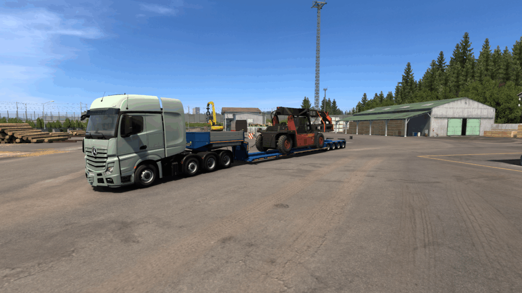 W-12 beginnt auf dem Holzverladehof eines Baumaterialbetriebs im Raum Nürnberg. Statt Palettenware oder Standardcontainern steht hier ein einziger, massiver Auftrag im Mittelpunkt: ein 54-Tonnen-Holzstapler, der auf einem Tieflader verzurrt wird. Zwischen Stapelholz, Werkslampen und Betonflächen wirkt selbst die Zugmaschine vergleichsweise klein – die Tour startet mit entsprechend stillem Respekt vor der Last.