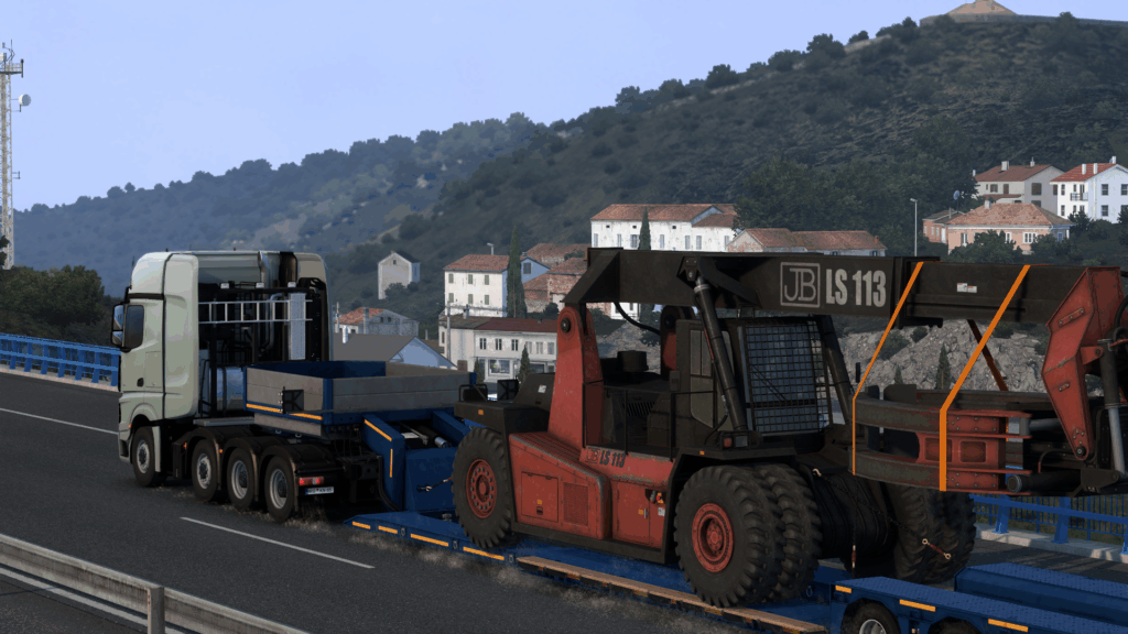 Im Großraum Barcelona verdichtet sich der Verkehr erneut. Zwischen mehrspurigen Zufahrten, Hafenanlagen und Stadtarchitektur tauchen zwei Motive auf, die W-12 im Logbuch fest verankern: die Hafenseilbahn über den Hafenanlagen und das Kolumbusdenkmal an der Uferzone. Während Kabinen durch die Luft ziehen und die Statue auf die See zeigt, rollt der Holzstapler im ganz normalen Logistiktempo durch die katalanische Metropole.